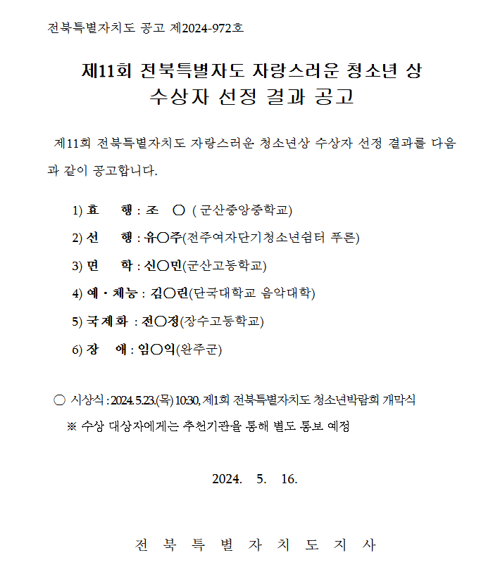 ‘제11회 전북특별자치도 자랑스러운 청소년상’ 6개 부문 수상자는 ▴효행 조 은(군산중앙중학교), ▴선행 유민주(전주여자단기청소년쉼터푸른), ▴면학 신재민(군산고등학교), ▴예체능 김태린(단국대학교 음악대학), ▴국제화 전해정(장수고등학교) ▴장애 임세익(완주군) 이다.
