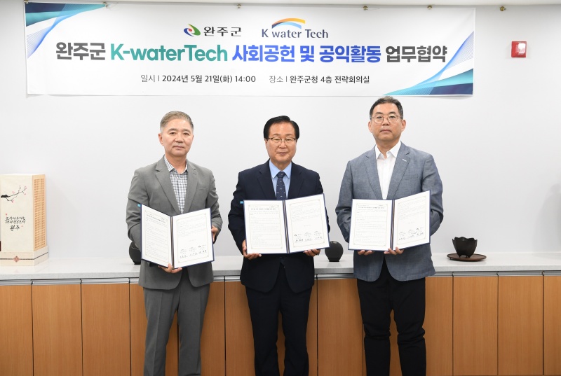 21일 완주군청에서 열린 협약식에는 유희태 완주군수, 조용재 케이워터기술 금강유역본부장, 이재현 케이워터기술 용담댐사업소장 등이 참석했다.