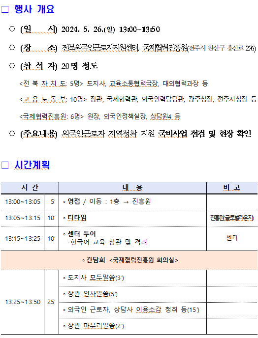 이 장관은 ”올해 외국인 근로자 도입 규모가 확대되고 다양한 업종에 많은 외국인 근로자들이 입국할 것으로 예상되는 만큼 외국인근로자의 안정적 정착을 위해 정부와 지자체가 합심해야 한다.“며, ”고용부와 전북특별자치도가 공동투자를 통해 이 지역에 최초로 외국인근로자 지원센터가 문을 열게된 만큼, 지역 내 외국인근로자의 정착을 지원하는 주춧돌로 자리매김하기를 바란다.“고 당부했다.
