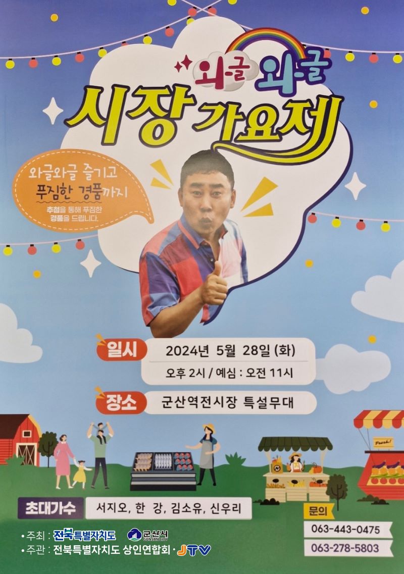 [군산=뉴??북] 전북특별자치도와 군산시가 주최하고, 전북상인연합회와 JTV전주방송이 주관하는 ‘와글와글 시장가요제’ 역전시장 편이 오는 5월 28일 군산 역전시장 내 주차장 특설무대에서 개최된다.