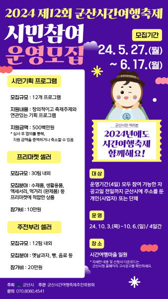 [군산=뉴저북] 군산시는 2024년 제12회 군산시간여행축제 시민참여프로그램(시민기획 · 프리마켓 · 주전부리) 운영자를 5월 27일(월)부터 6월 17일(월)까지 21일간 모집한다.