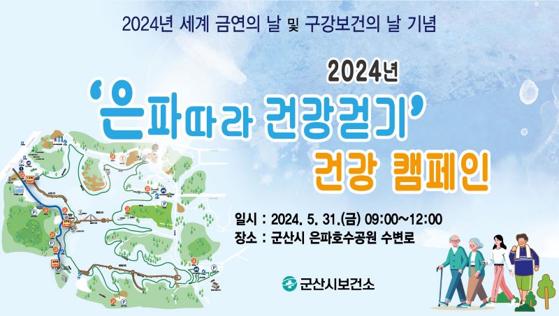 [군산=뉴전북] 군산시 보건소가 제37회 세계 금연의 날과 제79회 구강 보건의 날을 기념하여 5월 31일 군산시 은파호수공원 수변로에서 ‘은파따라 건강걷기’ 건강증진사업 통합 캠페인을 실시한다고 밝혔다.