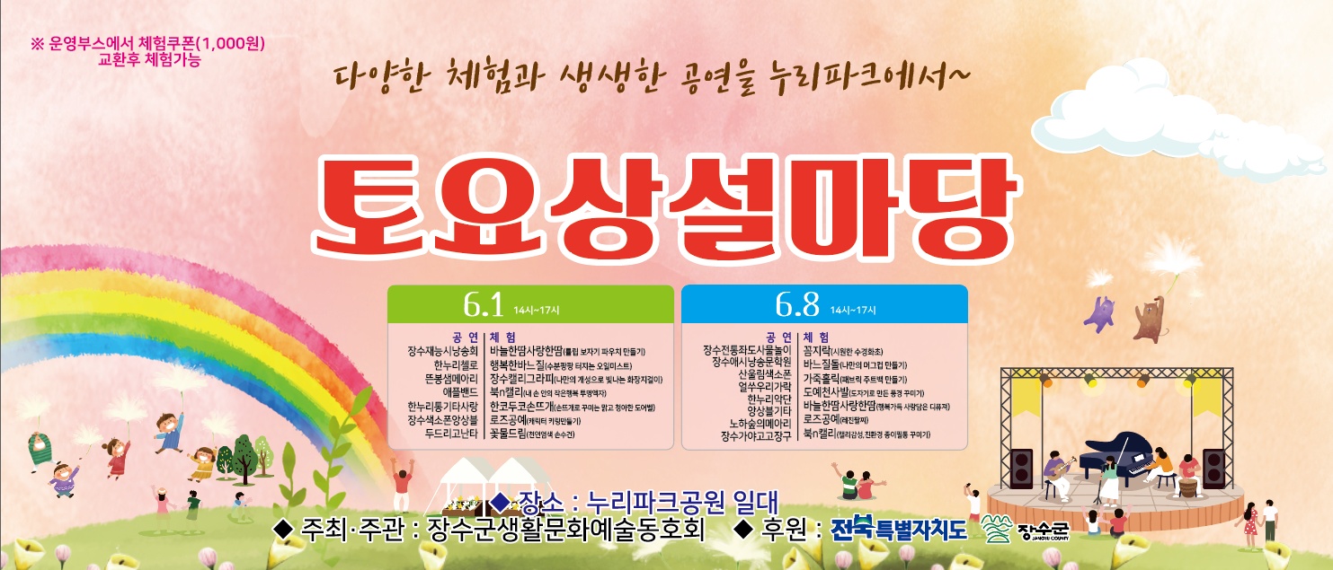 [장수=뉴전북]장수군은 오는 6월 1일과 8일 2회에 걸쳐 생활문화예술동호회네트워크(이하 생문동, 회장 정영모)가 누리파크 일대에서 ‘토요상설마당’을 개최한다고 밝혔다.