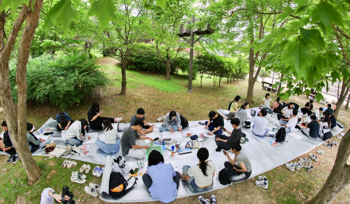 | 1. 지난 1일에 개최한 ‘제6회 평화사랑 그림그리기 국제대회’에서 아이들이 나무그늘아래 옹기종기 모여 그림을 그리고 있다. |