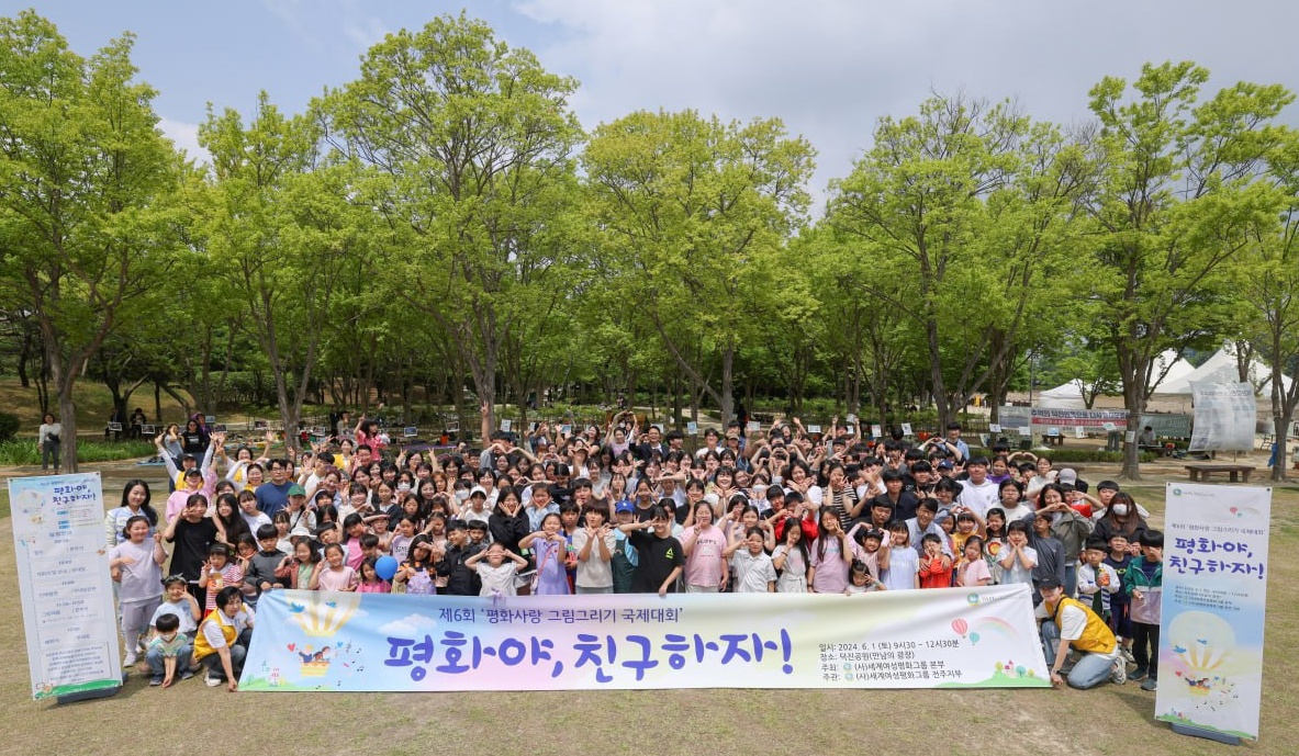 1. 지난 1일에 개최한 ‘제6회 평화사랑 그림그리기 국제대회’에서 평화의 마음을 그림으로 표현하고 단체사진을 찍고 있다.