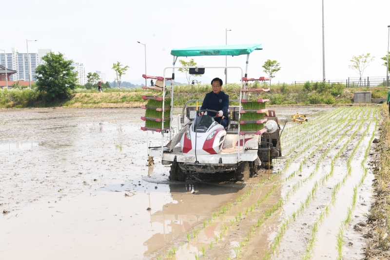 7일 삼례아리따운 아파트 주차장에서 열린 ‘사랑 드리미(米)’ 모내기 행사에는 유희태 완주군수와 서남용 완주군의회 의장을 비롯한 이장협의회 등 6개 단체 100여 명이 참석했다.