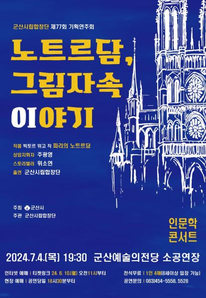 [군산=뉴전북] 군산시립합창단의 제77회 기획연주회 인문학 콘서트 ‘노트르담, 그림자 속 이야기’가 오는 7월 4일(목) 오후 7시 30분 군산예술의전당 소공연장에서 열린다.