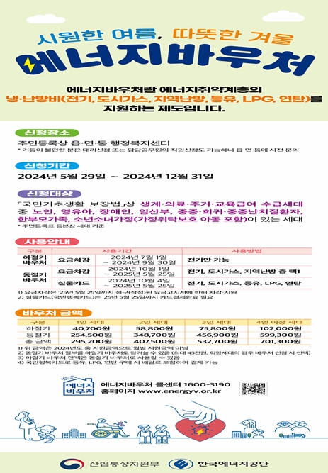 이종훈 에너지수소산업과장은 “올 여름 무더위가 예보된 만큼 취약계층의 여름나기가 힘들 것으로 우려된다”며, “에너지바우처 사업의 적극적인 홍보를 통해 사각지대를 최소화하고, 취약계층의 냉·난방비 경제적 부담 완화를 위해 노력하겠다”고 말했다.