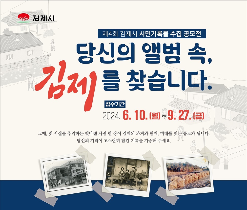 [김제=뉴전북] 김제시(시장 정성주)는 지역 역사와 생활문화를 알 수 있는 오래된 기록을 발굴하기 위해 오는 9월 27일까지당신의 앨범 속김제를 찾습니다를 주제로 시민기록물 수집 공모전을 진행한다고 밝혔다.