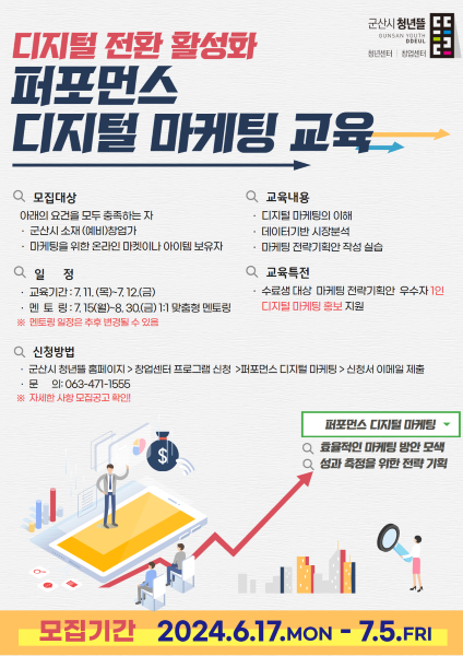 [군산=뉴전북] 군산시 청년뜰 창업센터가 지역 (예비) 창업가들의 디지털 마케팅 역량 강화를 위해 진행하는 퍼포먼스 디지털 마케팅 교육의 참여자를 6월 17일부터 7월 5일까지 모집한다고 밝혔다.