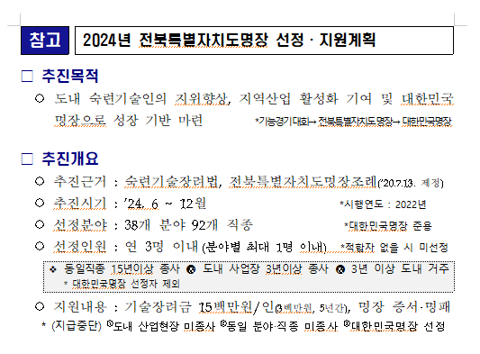 [도정=뉴전북] 전북특별자치도는 2024년 전북특별자치도명장 선정·지원 계획을 수립하고, 이달 20일부터 내달 25일까지 명장 신청자를 모집한다고 밝혔다.