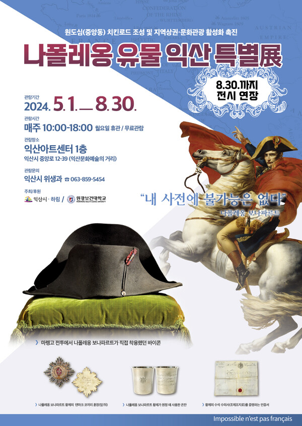 익산시 중앙동에서 진행되는 '나폴레옹 유물 익산 특별전'이 방문객들의 관심 속에 전시 기간을 2개월 더 연장한다.24일 익산시에 따르면 특별전은 지난 4월 30일 개관식을 시작으로 방문객 1만 명 돌파를 목전에 두고 있다. 일일 평균 200명의 관람객이 전시회를 찾아 개관부터 현재까지 9000여 명이 다녀간 것으로 집계됐다.관람객들은 전시회를 관람하고 문화예술의 거리 내 근대역사관, 공방, 카페 등에서 체험과 관광을 이어가며 지역에 활력을 불어넣고 있다.익산시는 원도심 중앙동 치킨로드 조성과 경제 및 문화관광 활성화를 위해 문화예술의 거리 익산아트센터에서 '나폴레옹 유물 익산 특별전'을 진행하고 있다.당초 관람 기간은 6월 말까지였으나 관람객들의 발걸음이 꾸준하게 이어지자 ㈜NS쇼핑과 특별전 재협약을 체결해 운영 기간을 8월 30일까지 연장했다.익산시는 철도 이용객과 익산시티투어 관광객의 중앙동 방문이 이어질 수 있도록 관람객 이벤트도 계속해서 운영할 예정이다.지역의 한 상인은 "나폴레옹 전시회 덕분에 방문객들이 식당과 카페를 찾아 지역에 활기가 돈다"고 전했다.정헌율 익산시장은 "나폴레옹 유물 특별전이 원도심에 활력을 불어넣는 촉진제가 될 것으로 기대한다"며 "불가능을 가능케 한 영웅의 의지를 되살려 중앙동 치킨로드 조성을 비롯해 지역 경제 및 관광 활성화를 위해 최선을 다하겠다"고 전했다.한편 나폴레옹 유물은 ㈜하림 계열사인 ㈜NS쇼핑이 판교 본사 '나폴레옹 갤러리'에서 상설 전시해 왔다. 김홍국 회장은 고향인 익산시 요청에 따라 이각모를 비롯한 유물의 익산 전시를 흔쾌히 수락했다.홍순일 기자 final19@daum.net