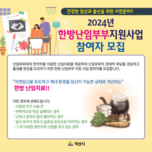 '한방 난임부부 지원사업'은 성별 구분 없이 부부 한 쌍 기준으로 230만 원을 지원한다. 지난 3년간 익산시 난임부부 93쌍이 한방 난임치료를 받아 22쌍이 임신에 성공했다.
