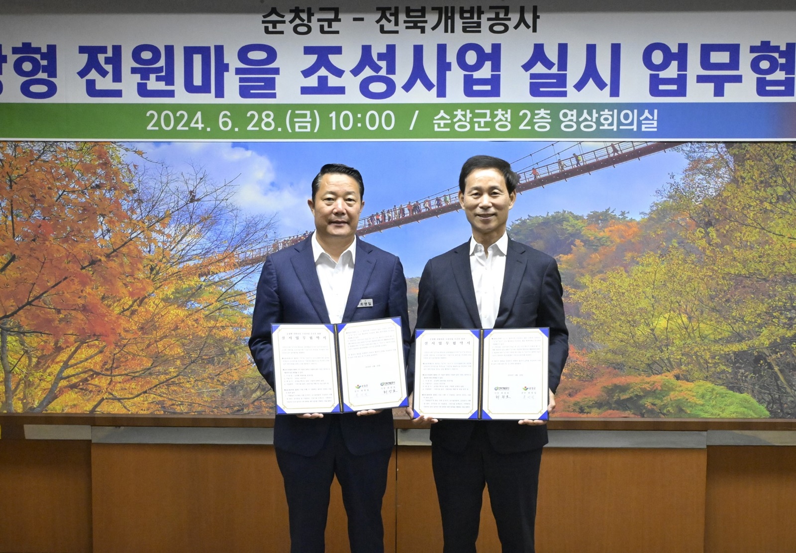 순창군이 28일 군청 2층 영상회의실에서 민선 8기 역점 사업인 순창형 전원마을 500호 조성사업의 내실 있는 추진을 위해 전북개발공사와 공동 추진을 약속하는 업무협약을 체결했다고 밝혔다.