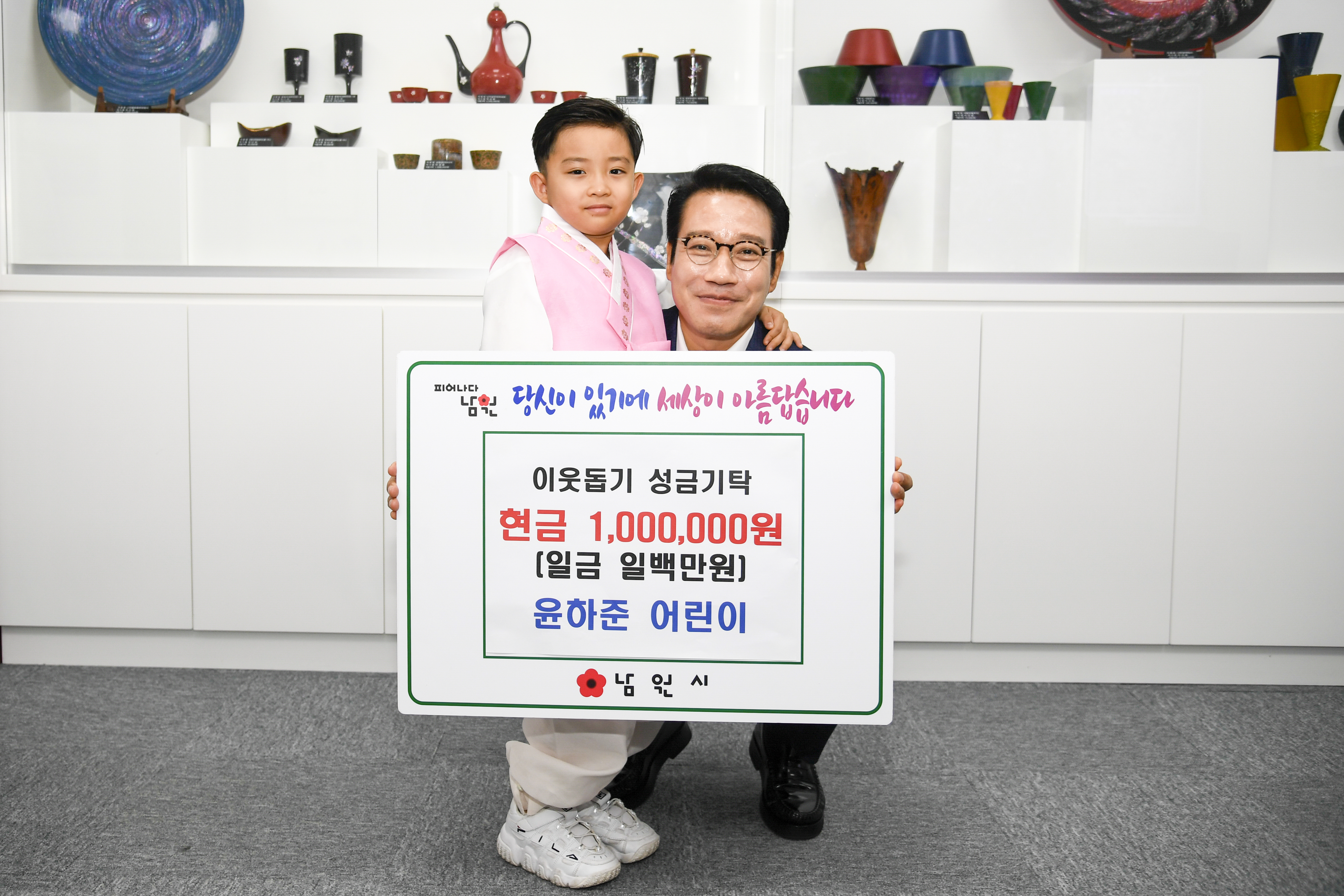 최경식 남원시장은 “윤하준 군의 예쁜 마음이 고스란히 전해지는 것 같다며 윤하준 어린이와 부모님께 다시 한번 감사의 말씀을 드리며 성금이 헛되이 쓰이지 않도록 잘 전달하도록 하겠다.”고 전했다.