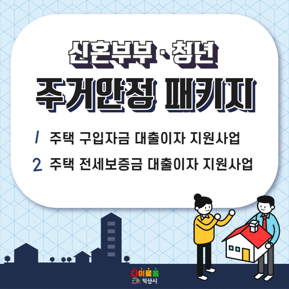 [익산=뉴전북] 전북 익산시가 신혼부부와 청년의 부담을 줄이고 안정적인 주거 환경을 조성하기 위해 주택 구입자금 지원을 강화한다.익산시는 '주택구입 대출이자 현금지원 시범사업'을 시행한다고 4일 밝혔다.현금 지원 시범사업은 고금리 상황으로 주택마련에 어려움을 겪는 신혼부부와 청년의 지역 정착을 유도하기 위해 대출 이자를 지원하는 사업이다.시는 협약 은행 대출상품을 이용하면 이자를 3% 지원해 왔으나, 정부정책 저금리 상품인 디딤돌과 보금자리론, 신생아 특례 대출 등에 비해 상대적으로 높은 이자율 때문에 신청률이 낮은 상황이었다.이에 기존 사업을 과감하게 중단하고 이자 지원 대상을 정부정책 저금리 상품을 포함한 모든 주택 구입용도 대출 상품으로 확대했다.대출잔액 1억원 내에서 최대 3%의 이자를 연 1회씩 2년간 지원한다.