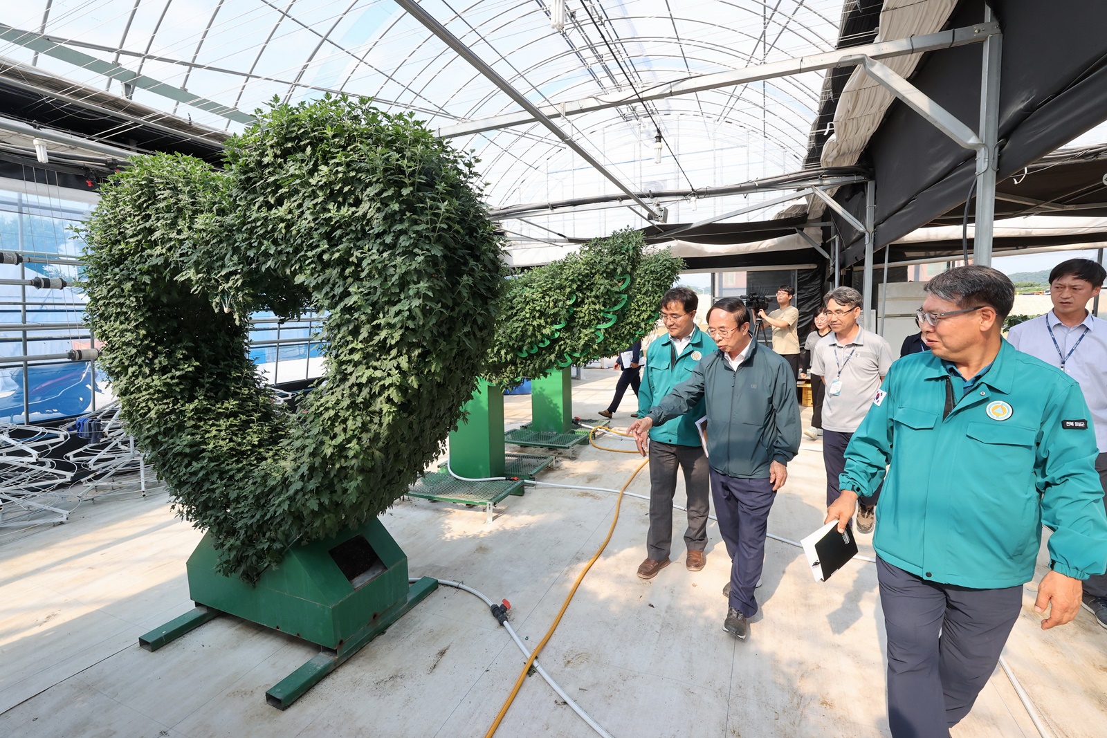 지난 4일 화분 국화와 현애 조형물 생산 현장을 점검한 심 민 군수는 장마와 무더위 속에서 국화 생산 관리에 고생하고 있는 관계자들을 격려했다.