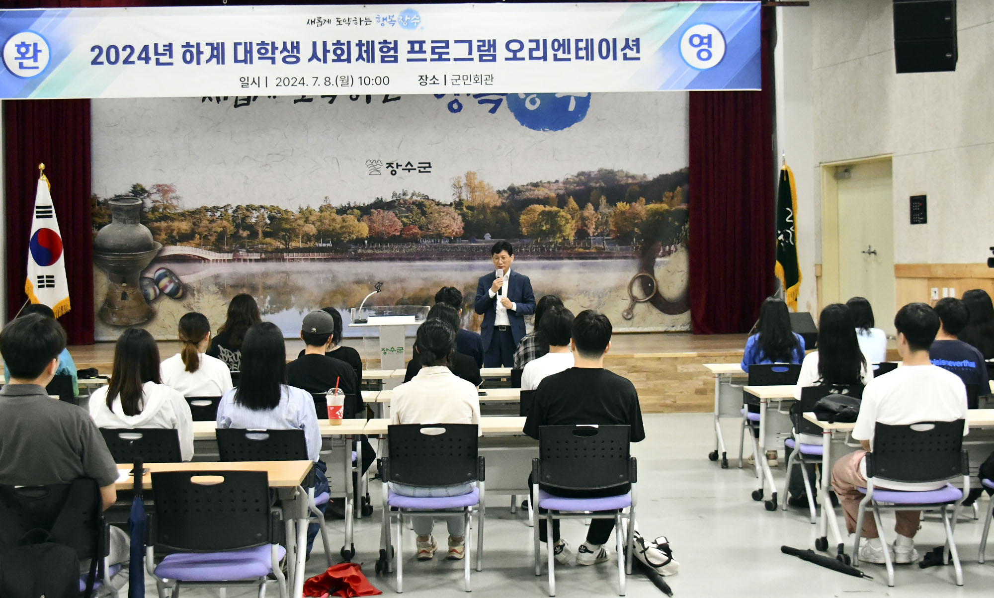 [장수=뉴전북]장수군은 지난 8일 군청 군민회관에서 ‘2024년 하계 대학생 사회체험 프로그램’ 오리엔테이션을 진행했다고 밝혔다.