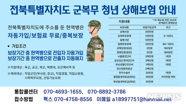 [도정=뉴전북] 전북특별자치도는 군복무 중인 도내 청년들의 안전과 복지를 위해 2년째 추진하고 있는 ‘군복무 청년 상해보험 가입 지원 사업’이 큰 호응을 얻고 있는 것으로 나타났다.