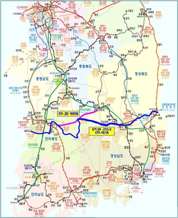 국가 고속도로망은 남북방향 10개 축과 동서방향 10개 축으로 구성돼 있다. 동서 10개 축 가운데 동서 3축은 새만금에서 포항까지 이어지는 고속도로 구간으로, 대구~포항 구간은 현재 운영 중에 있으며, 새만금~전주 구간은 내년말 개통 예정을 목표로 공사 중이다.