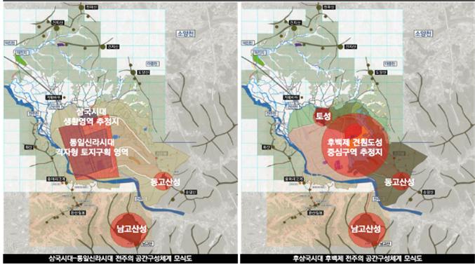또한 일제강점기에 발간된 ‘전주부사’의 성곽 지도와 그동안 발굴성과를 종합적으로 고려했을 때 동고산성과 남고산성, 노송동 일원을 중심으로 후백제의 궁성과 도성이 조성됐을 것으로 시는 조심스럽게 예측하고 있다.