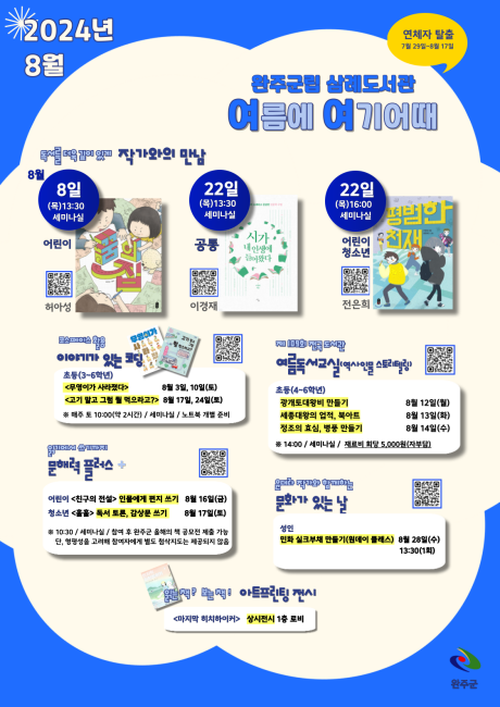 [문화=뉴전북] 완주군립 삼례도서관이 여름방학 기간을 맞아 ‘여름에 여기 어때’를 주제로 작가와의 만남, 독서교실, 문해력 향상 프로그램, 전시 체험 등 다양한 독서프로그램을 개설하고 참여자를 모집한다.