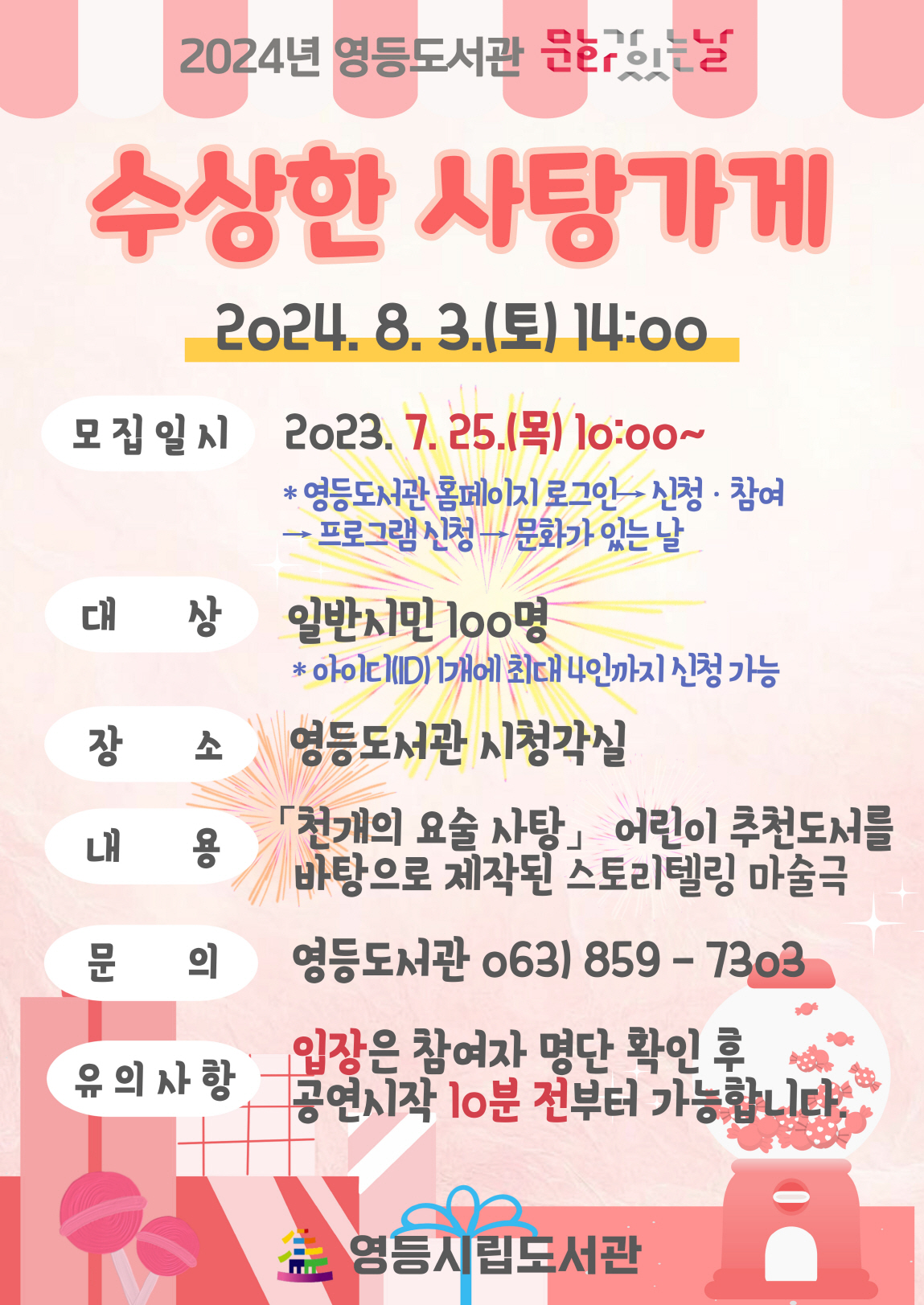 [문화=뉴전북] 익산시 영등시립도서관이 여름방학을 맞아 '문화가 있는 날' 행사로 오는 8월 3일 시청각실에서 어린이 마술극 '수상한 사탕가게'를 선보인다.