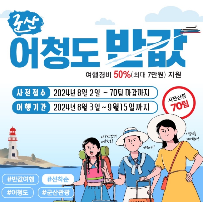 군산시가 타 지역에 거주하는 군산 방문객을 대상으로 ‘군산 어청도 반값 여행’ 참여자 70팀을 8월 2일 오전 10시부터 온라인을 통해 선착순으로 모집한다.