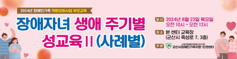 이번 교육은 8월 22일에 본 센터에서 진행되며 모집인원은 군산시 장애인 부모 10명 내외이다. 신청 기간은 오는 5일부터 16일까지이다.