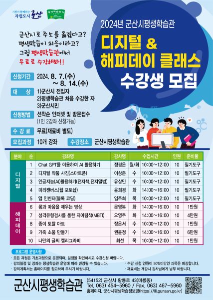 [군산=뉴전북] 군산시 평생학습관에서는 오는 8월 19일부터 9월 13일까지 타지역에서 군산시로 전입하거나 평생학습을 처음 배우는 시민 대상으로 디지털 평생학습 및 해피데이 클래스 10개 강좌를 운영한다고 밝혔다.