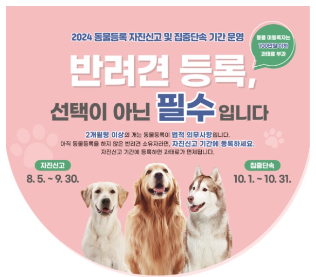 한편, 자진신고기간의 실효성 확보를 위해, 자진신고기간이 끝난 직후 인 10월 1일부터 10월 31일까지 반려견 출입이 많은 공원, 산책길 등을 중심으로 집중단속을 실시할 계획이다.