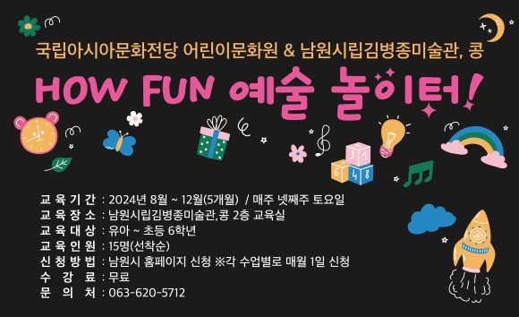 • - 남원시립김병종미술관,콩에서‘How Fun 예술놀이터’ 어린이 문화예술교육 프로그램 운영 - 유아(6세~7세) 및 초등(1학년~4학년) 대상, 8월부터 12월까지 매월 1일 접수
