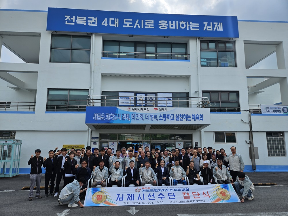 [김제=뉴전북] 김제시(시장 정성주)는 7일 김제시체육회 회의실에서 ‘2024 61회 전북특별자치도민체육대회 출전 선수단 결단식을 갖고 종합우승에 도전한다고 밝혔다.
