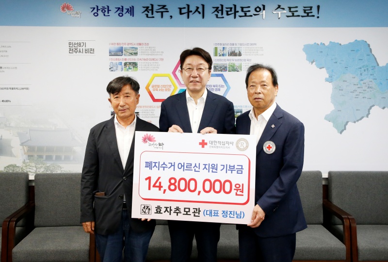 효자추모관 관계자들은 연일 35도 이상의 기록적인 폭염이 지속되는 가운데 생계를 위해 쉬지 않고 일하는 전주시 저소득 폐지 수거 어르신을 돕고 싶다는 뜻을 담아 기부활동에 동참했다.