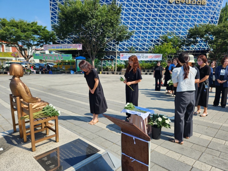 전주시는 14일 풍남문광장 평화의 소녀상에서 전주 평화의소녀상건립 시민추진위원회(대표 방용승) 위원들과 전주시여성단체협의회(회장 온은아) 회원, 시민 등 20여 명이 참석한 가운데 평화의 소녀상에 헌화하고 피해자의 아픔을 위로하며 추모하는 시간을 가졌다.