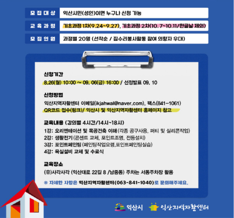 참여를 희망하는 경우 오는 26일부터 9월 6일까지 익산지역자활센터 팩스(063-841-1061) 또는 담당자 이메일(ikjahwal@naver.com)로 신청하면 된다. 각 회당 20명을 모집하고 교육 수료 후 집수리 봉사활동 참여 의향자를 우대 선정할 계획이다.
