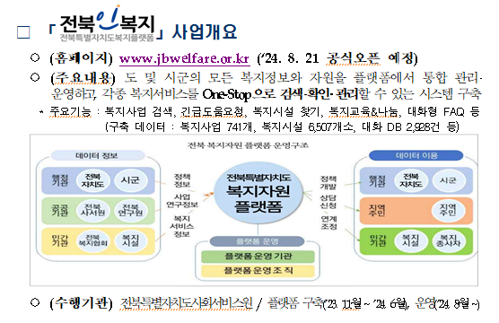 전북특별자치도는 지난해 11월부터 민선8기 공약사업으로 이용자 중심의 전북 복지자원 통합 플랫폼을 구축해 왔다.