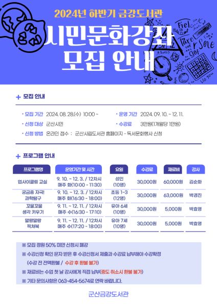 어린이 독서회 신청은 8월 21일 오전 10시부터, 시민문화강좌 신청은 8월 28일 오전 10시부터 선착순으로 군산시립도서관 홈페이지에서 가능하다.