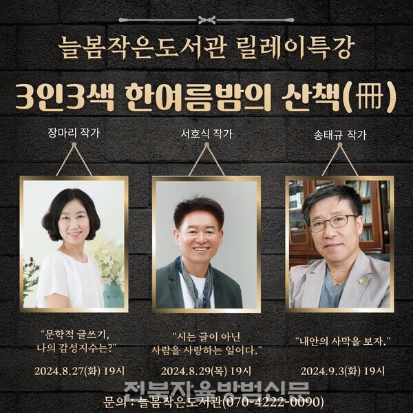 익산시는 늘봄작은도서관(관장 윤석노)이 '3인 3색 한여름밤의 산책(冊)'을 주제로 '배움-채움 특별강연'을 개최한다고 23일 밝혔다.