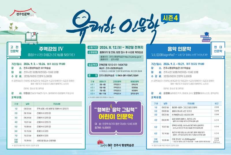 이와 관련 전주시평생학습관은 올해 유쾌한 인문학을 ‘고전과 현대 인문학’을 주제로 정하고, ▲동양고전의 정수인 주역 강의와 현대미학 ▲현대미술 ▲현대철학 ▲문학과 음악의 총 4개 시즌을 운영하고 있다.