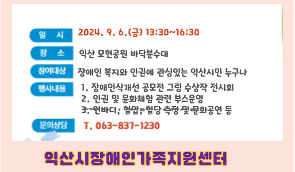 한편, 익산시장애인가족지원센터는 장애인과 비장애인 모두가 자유롭고 평등한 지역사회가 되도록 인권 침해 및 차별 행위 근절을 위한 인권사업을 수행하고 있다.