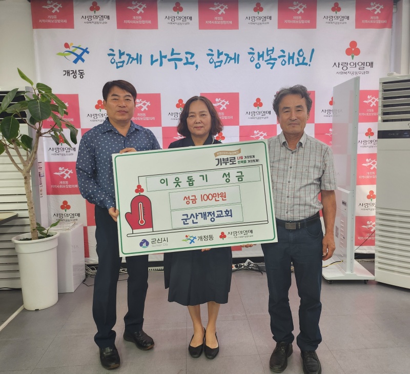 군산개정교회는 지역사회의 어렵고 힘든 이웃을 위해 2012년 이웃돕기 성금 50만 원을 시작으로 2017년도부터는 성금 100만 원을 매년 후원했으며, 특히 올해에는 양대 명절인 설날에 이어 추석에까지 후원하는 등 총 1150만 원을 지금까지 후원하고 있다.