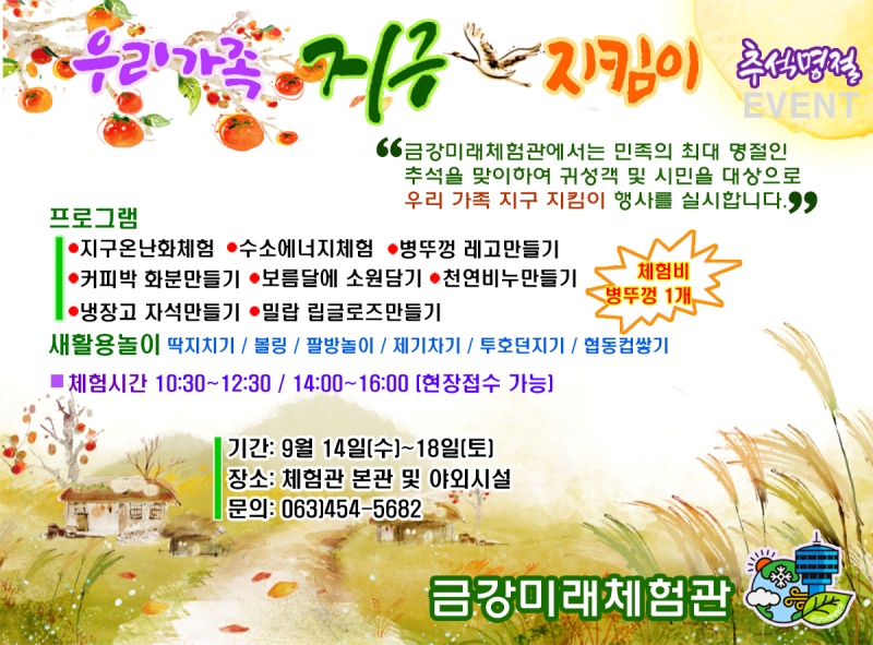 [군산=뉴전북] 금강미래체험관은 민족의 최대 명절인 추석을 맞아 오는 14일부터 18일까지 귀성객과 시민을 대상으로 ‘우리 가족 지구 지킴이’ 행사를 실시한다.