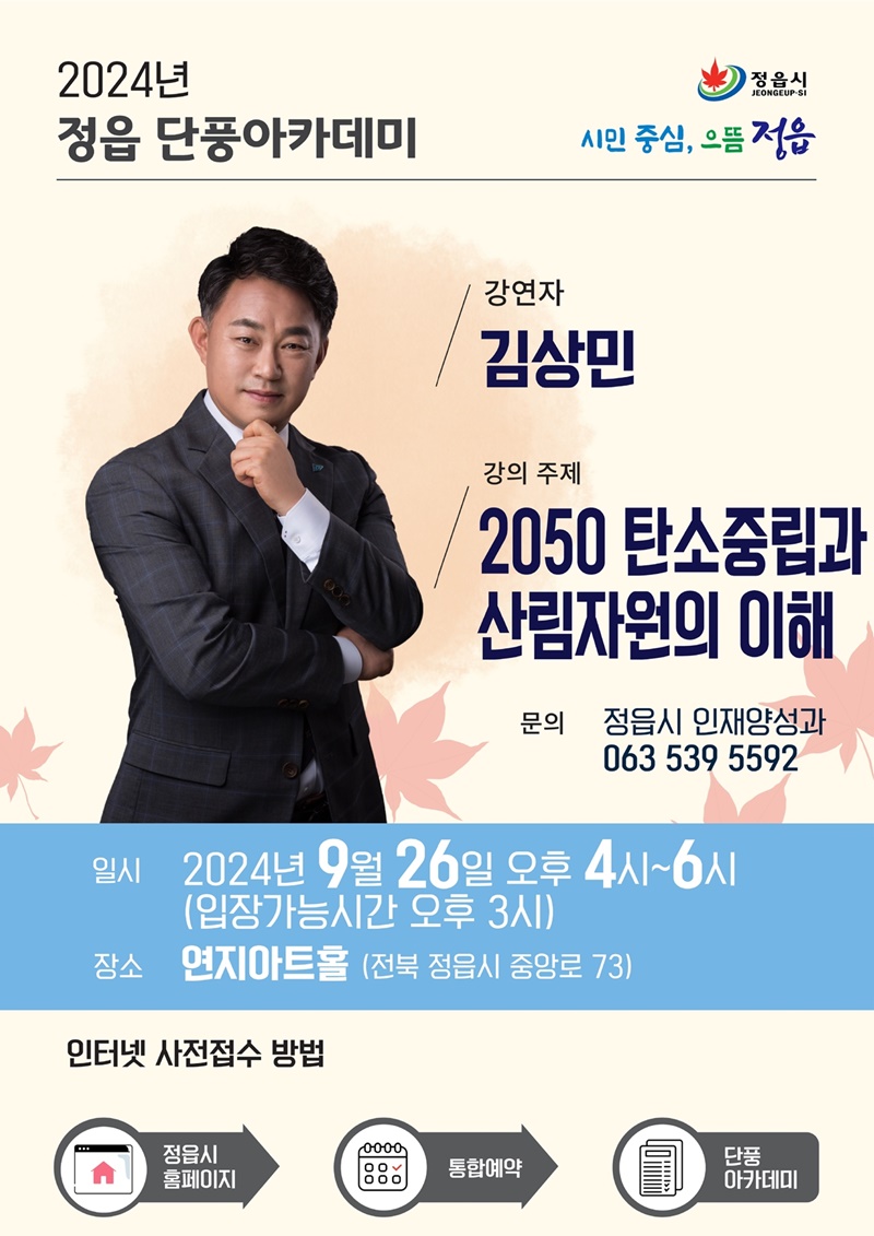 ‘정읍 단풍아카데미’는 시가 시민들에게 평생학습의 기회를 제공하고자 매년 7월부터 10월까지 매월 한 차례씩 개최하는 강연 시리즈로, 각 분야의 저명한 인사들이 참여해 시민들에게 전문 지식과 삶의 지혜를 전달하고 있다.