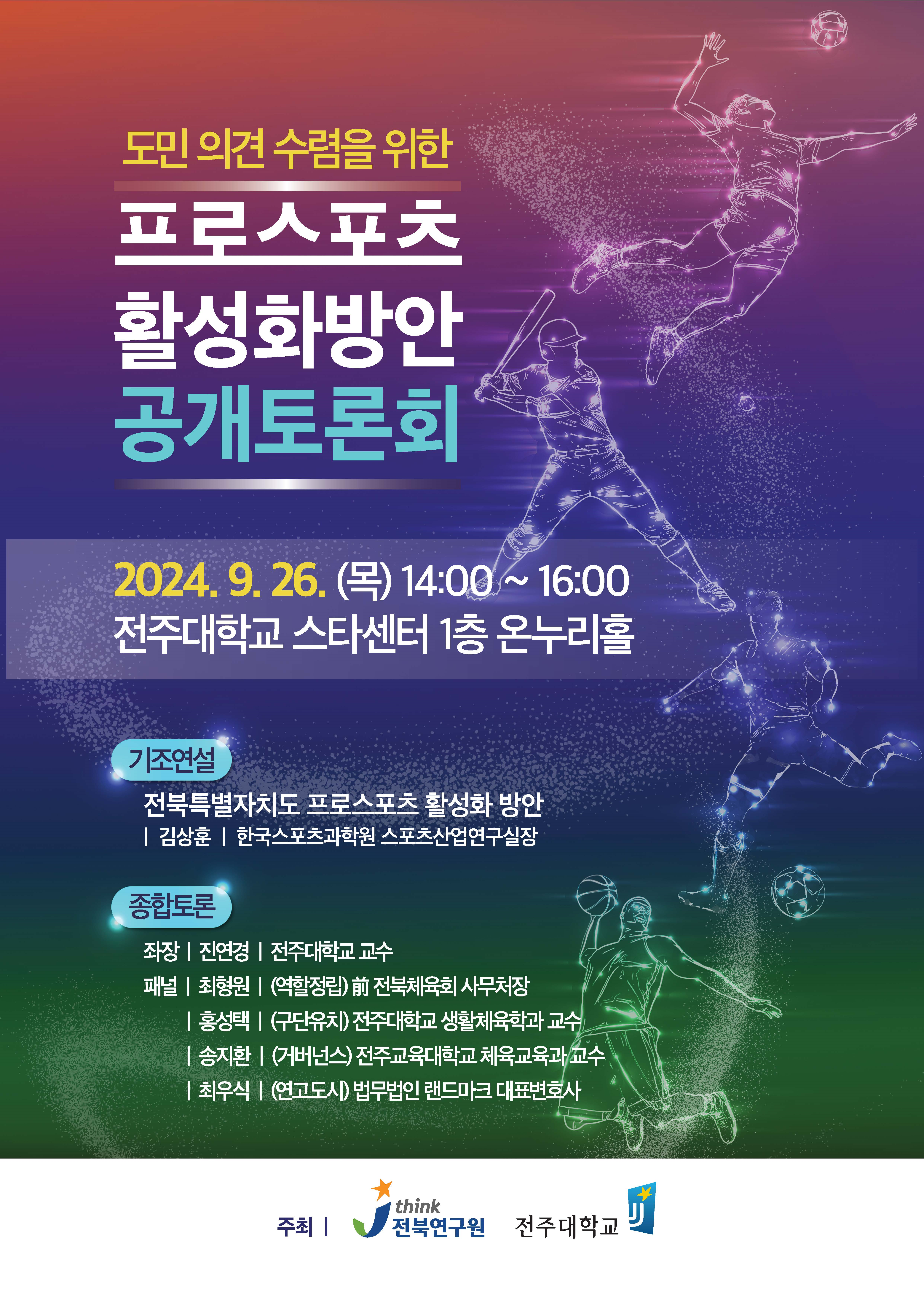 이번 공개토론회는 이명연 전북자치도의회 부의장을 비롯하여 전주대학교 윤찬영 대외부총장, 강승묵 문화융합대학장 등이 자리를 함께한다. 또한 전북자치도, 전주시 체육정책 담당자와 프로스포츠 분야 전문가 및 팬들이 모여 현장 중심의 활성화 방안에 대해 논의한다.