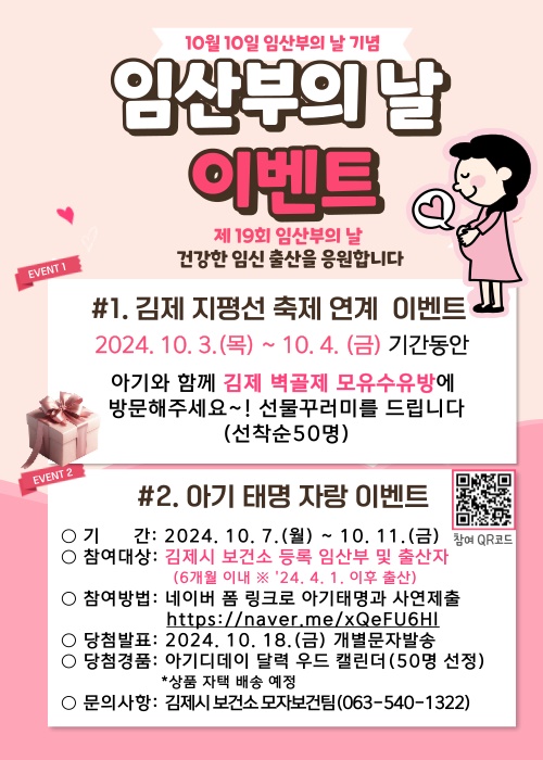 김은주 건강증진과장(직무대리)은 “임산부의 날 운영을 통해 출산의 중요성을 알리고, 임산부를 배려하는 출산 친화적 분위기를 조성하여 아이 낳기 좋은 김제시를 만들기 위해 노력하겠다”고 말했다.
