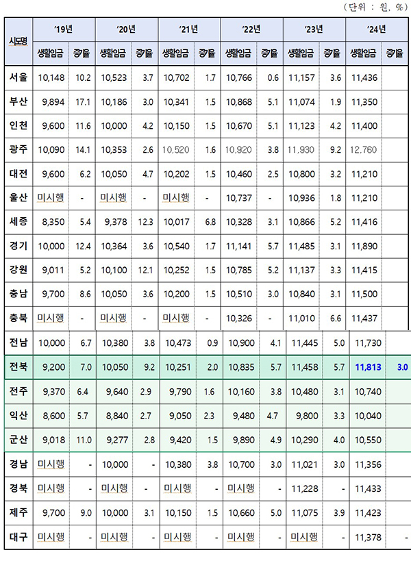 전북자치도는 2024년 기준 생활임금을 시행 중인 17개 광역자치단체 중 세 번째로 높은 수준을 유지하고 있다.