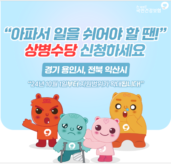 상병수당 지원 대상은 15세 이상 65세 미만의 기준중위소득 120% 이하 근로자여야 하며, 4일 이상 입원하거나 8일 이상 재택·통원 치료를 받아야 한다. 국민건강보험공단 익산지사에 상병수당을 신청하면 심사를 거쳐 1일 47,560원씩 최대 150일 소득 지원을 받을 수 있다.