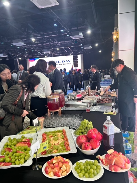 [장수=뉴전북]지난 2일, 주몽골 대한민국 대사관 주재하에 몽골 울란바토르 호텔에서 열린 건국절 축하 행사 만찬에 장수군 대표 농특산물인 한우, 사과, 오미자청, 샤인머스켓이 선보였다.