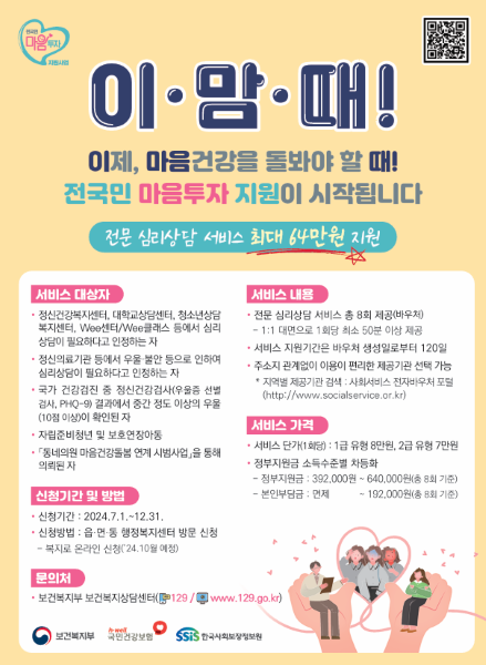 ‘전국민 마음투자 지원사업’은 7월 1일부터 시행되고 있는 사업으로, 우울·불안 등 정서적 어려움이 있는 국민에게 대화 기반의 전문 심리상담 서비스를 제공하는 것을 목적으로 한다.